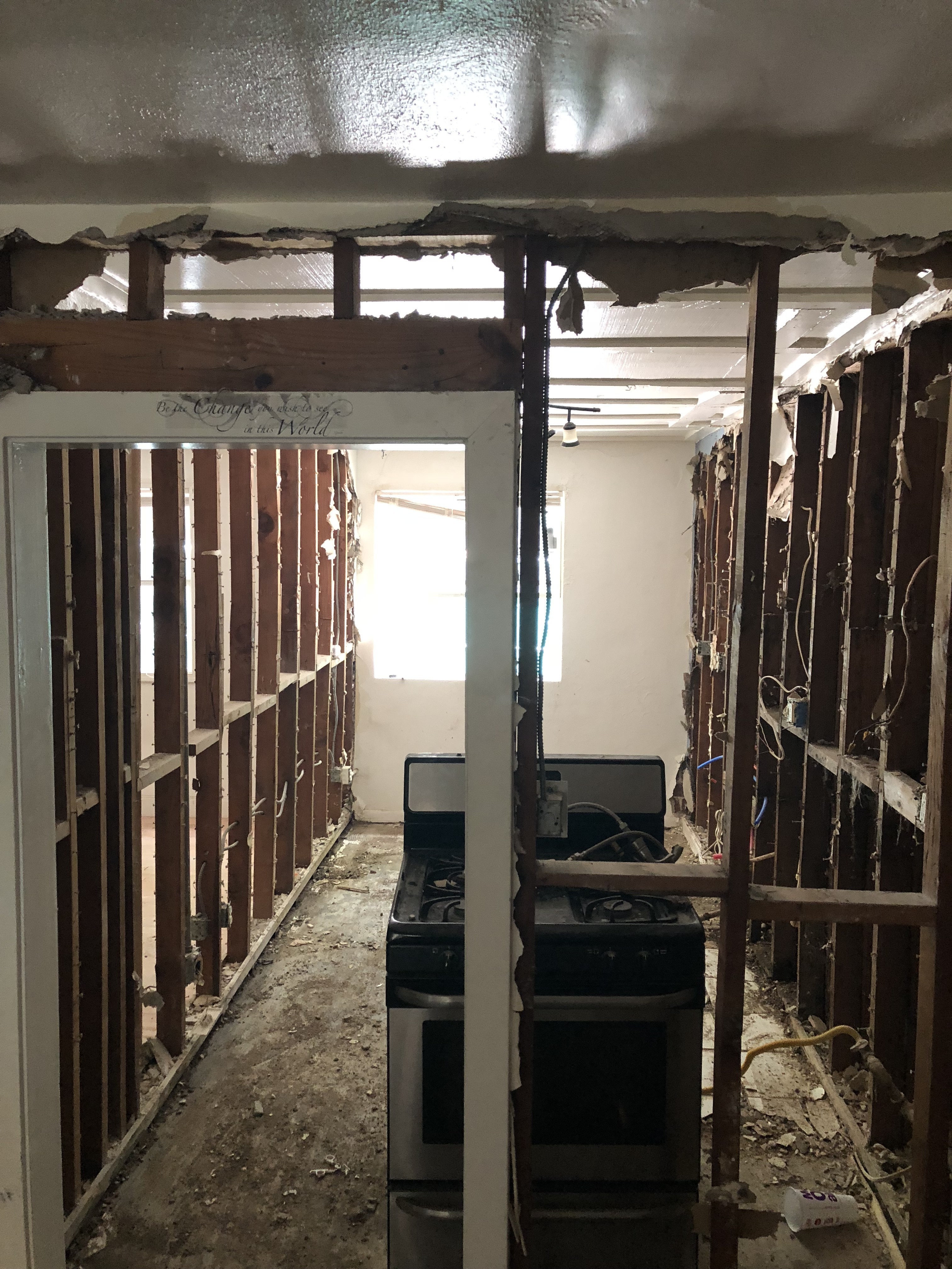 Removing every single nail. We have one team that is our point of contact through the whole project from here on out. Currently we have 10 units down, while the other 8 are still occupied. We are demoing all of them, but only hanging in top units. We will hang in bottom units if the top unit has been demoed already, just to protect our product if something would happen during the demo process.